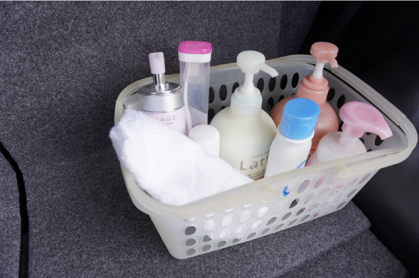シャンプー、リンス、ボディソープ、そしてタオルが入った「マイかご」。これがいつでもスタンバイされているんです。